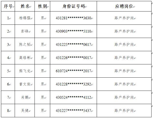 根据《湖南省高速公路集团有限公司所属分子公司2024年第二批公开招聘公告》的要求,经报名、资格审查、面试、心理测试、体检、背景调查和研究决定,确定以下8人为湖南省高速公路集团有限公司怀化分公司拟聘用人员,现进行公示。