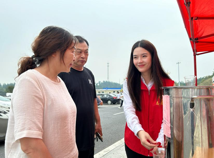 “小心菊花茶烫!”“我帮您拍照,请看镜头哦!”这一声声温暖的话语关心着每位在湘乡东服务区停留休息的司乘人员。中秋遇上国庆,双节假期首日,在湘乡东服务区到处可以看到这一抹抹别样的“路灯”志愿红。