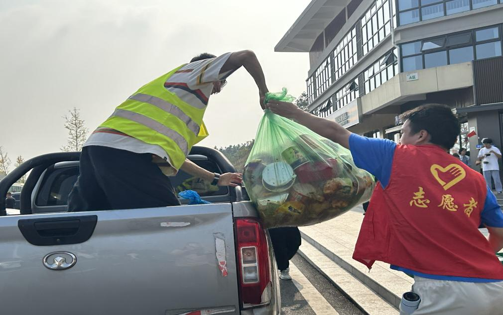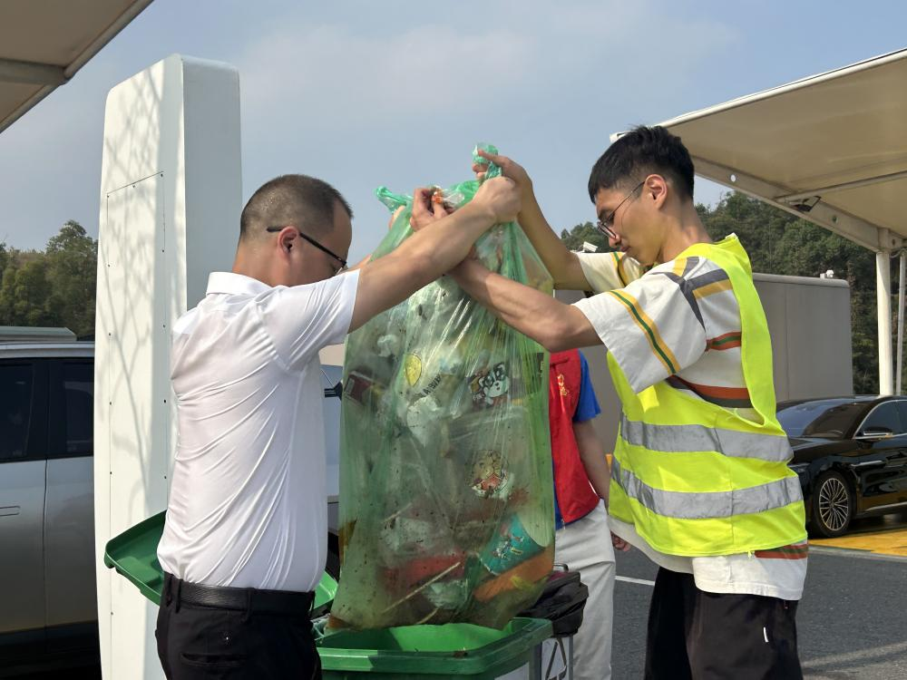 服务区经理宾泽祥带领两位9月新入职的00后小员工杨鑫和罗春意走遍服务区每个角落,捡拾路边的垃圾,更换新的垃圾袋。面对满是泡面汤的垃圾桶他们毫不嫌弃,烈日下汗水浸湿了志愿者服,他们也一边忙碌一边打着趣。宾经理不禁夸奖他们“这才是青春的样子!”