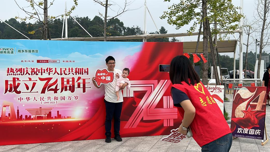 值得一提的是湘乡东服务区特地为双节布置了打卡区域,当司乘人员来到湘乡东服务区,感受到的不仅是用心服务,还能全家人拍上美美的节日照片,打卡墙区域的“路灯”志愿者正贴心地为游客们拍下温馨美好的照片。游客们开心地检阅着照片,纷纷给予好评:“拍得真好!没想到到高速服务区还能打卡拍照呢!”