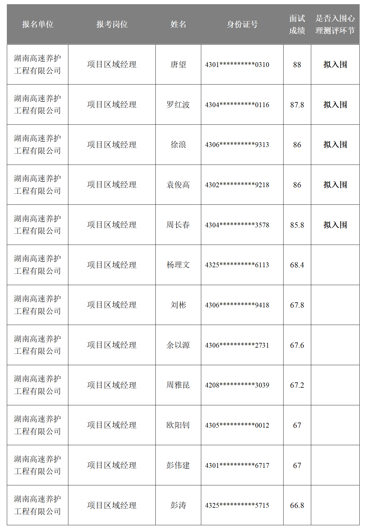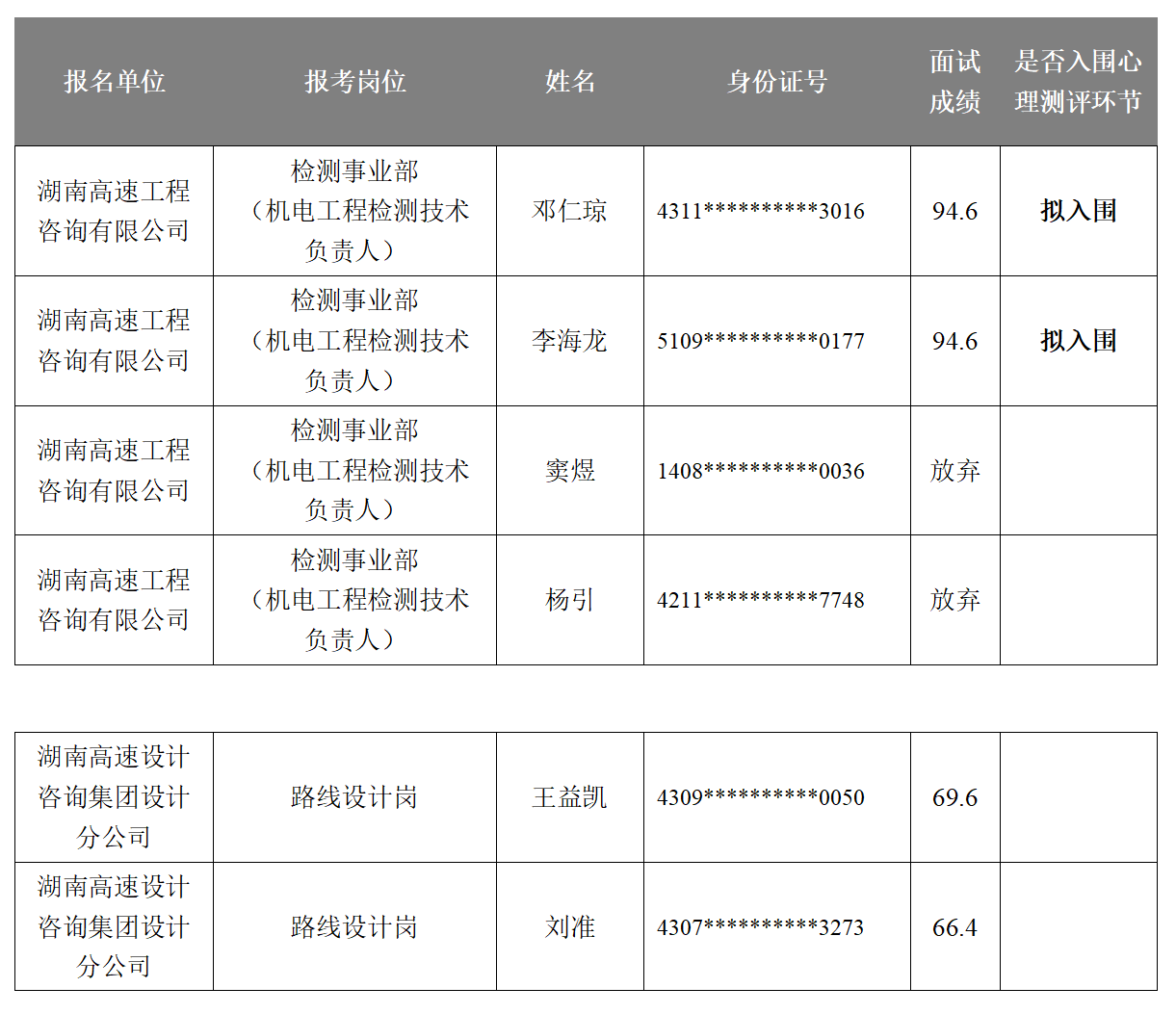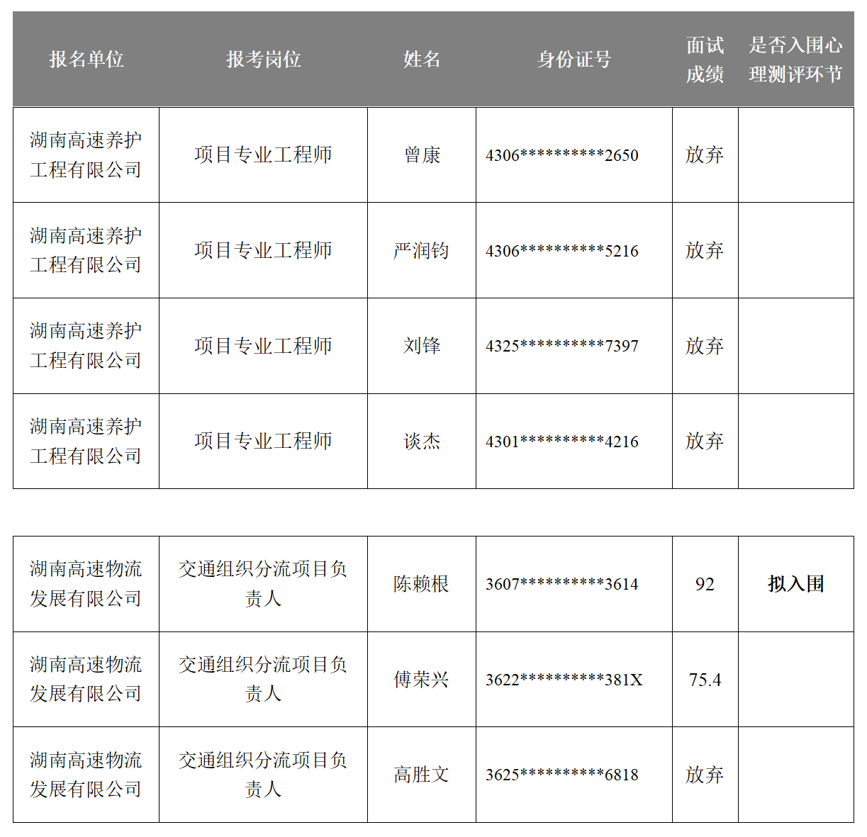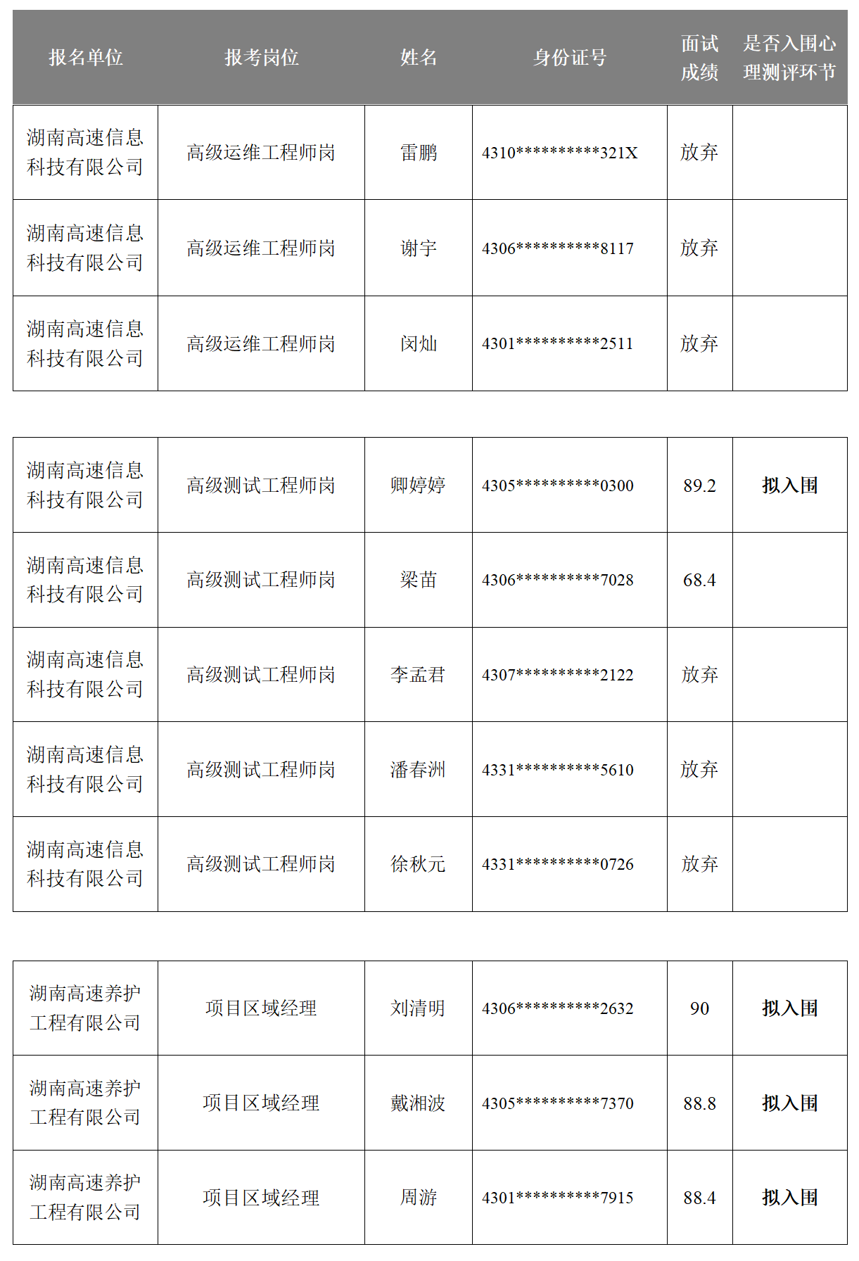湖南省高速公路集团有限公司2025年长期公开招聘成绩公示
